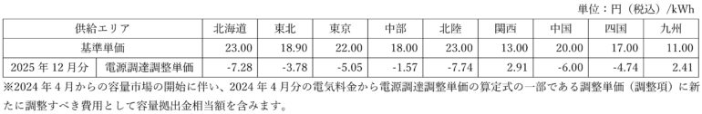 この度、2025年12月分の電気料金に適用される電源調達調整単価が以下の通り確定しましたので、お知らせいたします。
