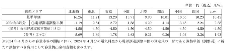 この度、2026年3月分の電気料金に適用される電源調達調整単価が以下の通り確定しましたので、お知らせいたします。