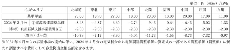 この度、2026年3月分の電気料金に適用される電源調達調整単価が以下の通り確定しましたので、お知らせいたします。